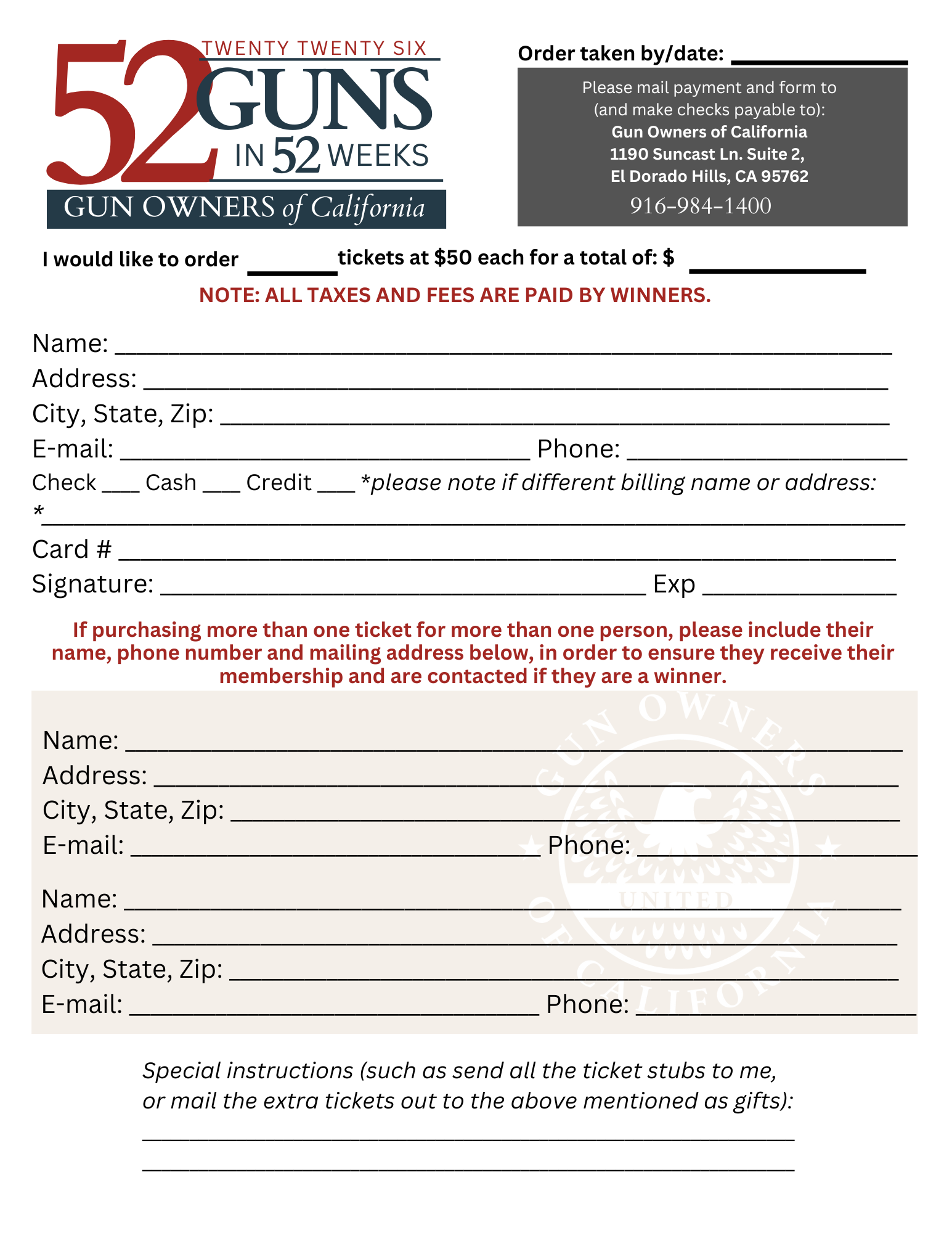 California law prohibits online raffle sales; thus all tickets are sold over the phone, through the mail, or in person. Cash, check, and credit cards accepted. * ALL TAXES AND FEES ARE RESPONSIBILTY OF WINNERS