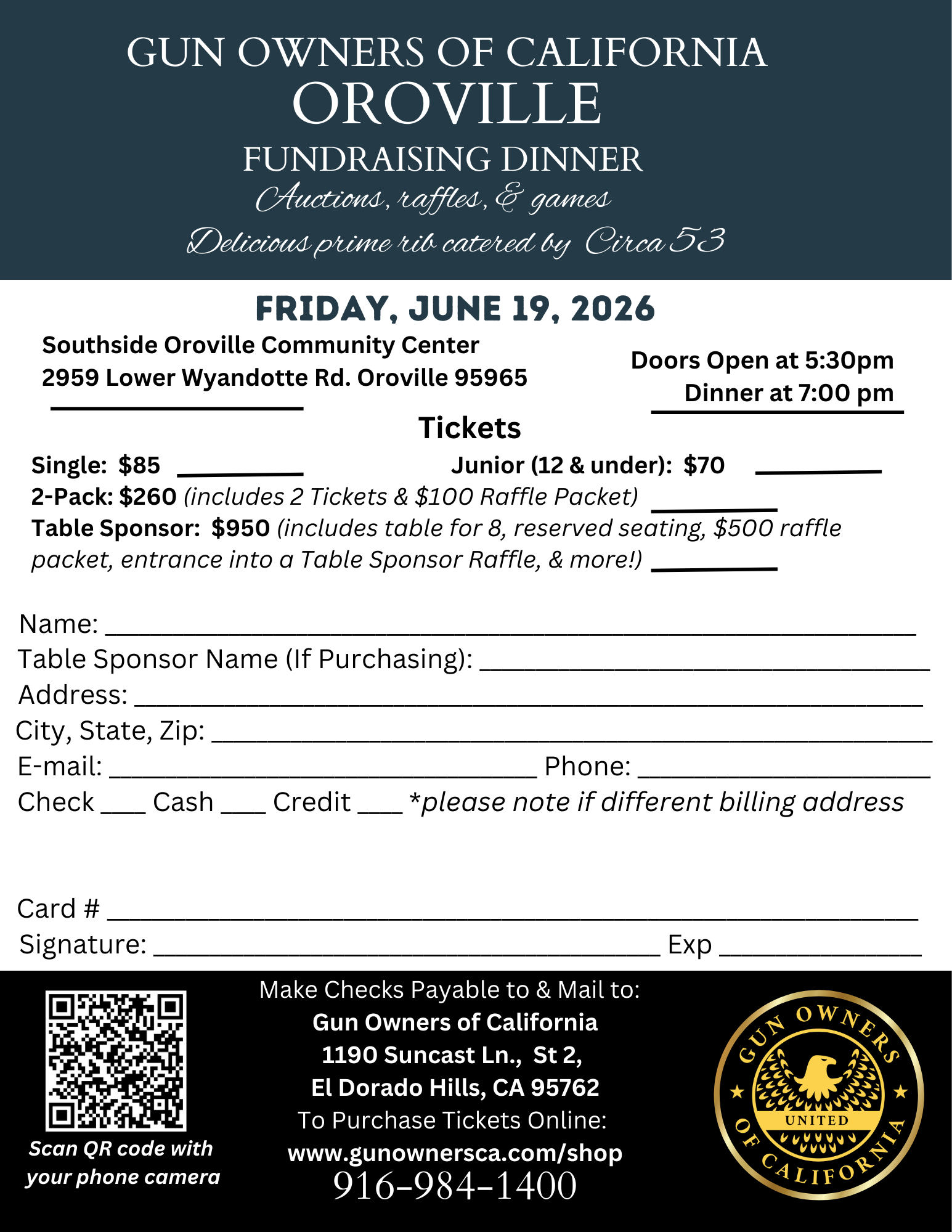 Join us on June 19th at the Oroville South Side Community Center for an unforgettable evening featuring a full prime rib dinner, drinks, games, raffles, and a lively auction packed with firearms, gear, and exclusive items. This isn’t just a dinner—it’s a high-energy night where freedom-minded Californians come together to support the fight for their rights.